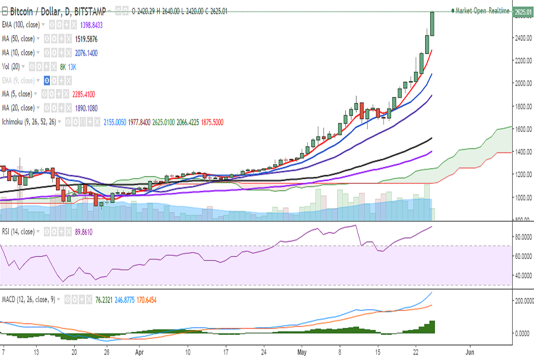 BTC/USD soared higher as the bitcoin community reached consensus on the scaling issue and hit a fresh all-time high at 2640 levels on Thursday. It is currently trading at 2620 levels at the time of writing (Bitstamp).