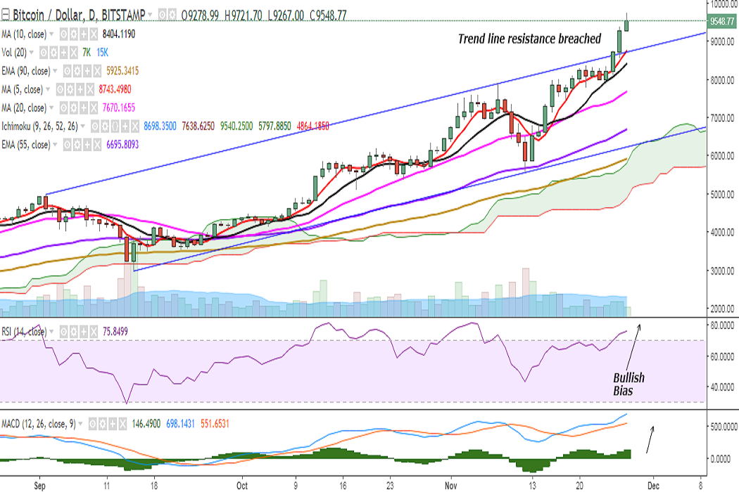 BTC/USD surged higher on Monday as it broke above the trend line joining 7888 and 8354. It has hit a fresh all-time high at 9721 so far in the day and is currently trading at 9550 levels at the time of writing (Bitstamp).