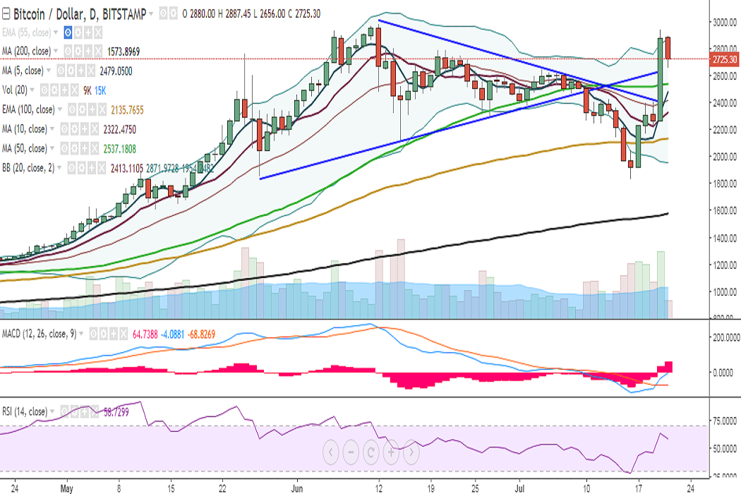 BTC/USD skyrocketed on Thursday, driven by the reports of BIP 91 lock-in. It stopped short of its all-time high 2980 levels and hit 2938 levels. The pair is currently trading in the red at 2758 levels at press time (Bitstamp).