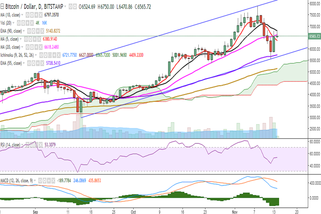 BTC/USD surged to 6750 levels so far in the day but failed to sustain its strength above 20-DMA. It is currently trading at 6545 levels at the time of writing (Bitstamp).