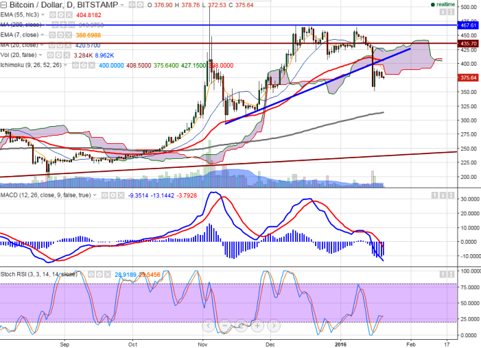 - BTC/USD has broken major trend line support $400 (trend line joining $294 and $310) and declined till $350. It is currently trading around $375.