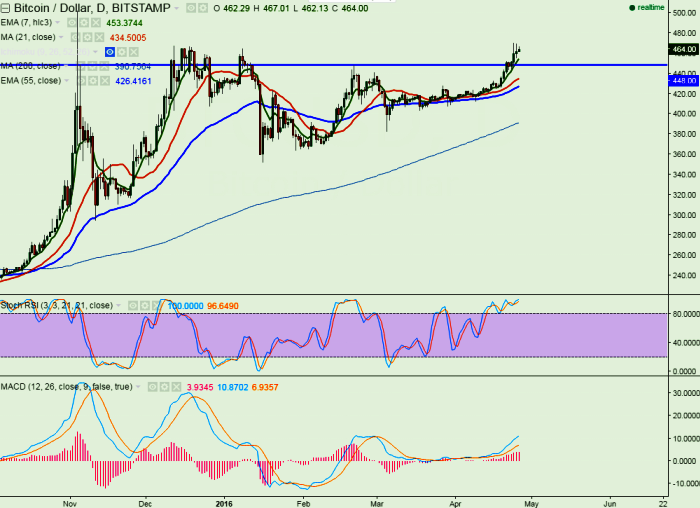 - BTC/USD has once again retreated after making a high of $469.47. It is currently trading around $464.