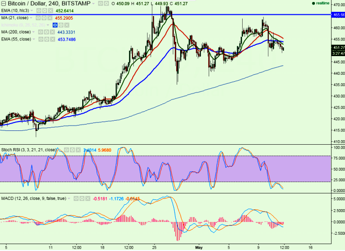 - BTC/USD has once declined till $447 after making a high of $457.99 yesterday. It is currently trading around $450.