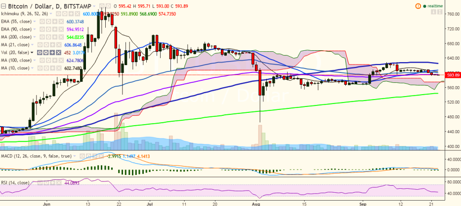 BTC/USD faces immediate resistance at 600 (55 EMA) and a break above would target 610 levels (psychological)/ 628 (September 11 high).