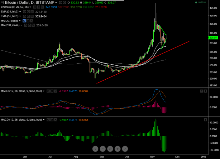 - BTC/USD has recovered till $350 at the time of writing and declined till $333. It is currently trading around $335. Short term trend is still bearish as long as resistance $370 holds.