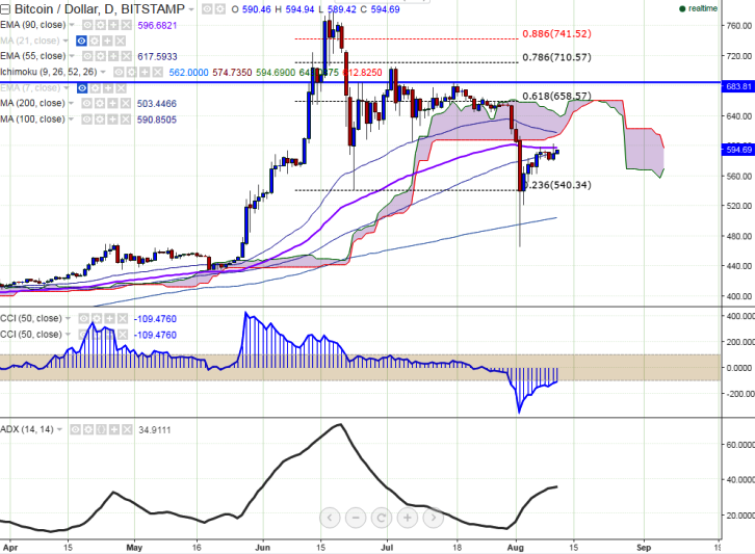 BTC/USD has declined after jumping till $603 yesterday. It is currently trading at $593 (Bitstamp).