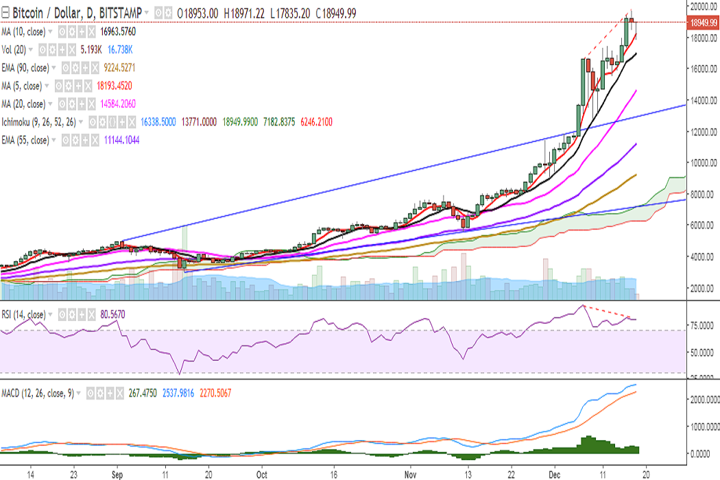 BTC/USD traded higher over the weekend to hit a fresh all-time high at 19666 levels. It is currently trading at 18955 levels at press time.