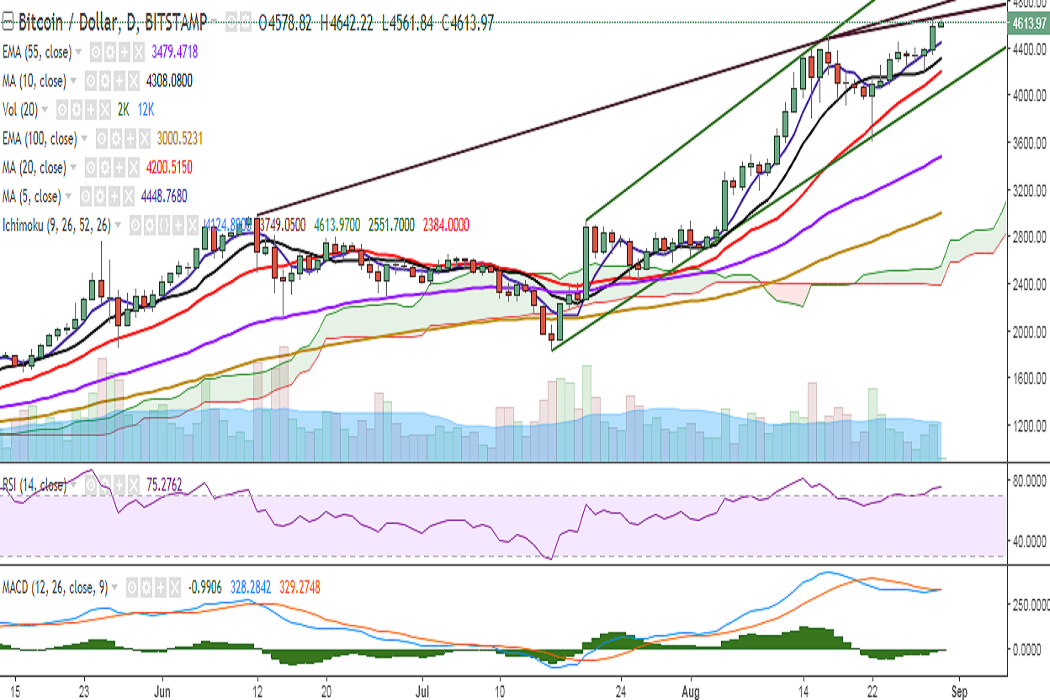 BTC/USD broke above the 4600 mark on Tuesday and hit a fresh all-time high at 4649. It is currently trading at 4623 levels at the time of writing (Bitstamp).