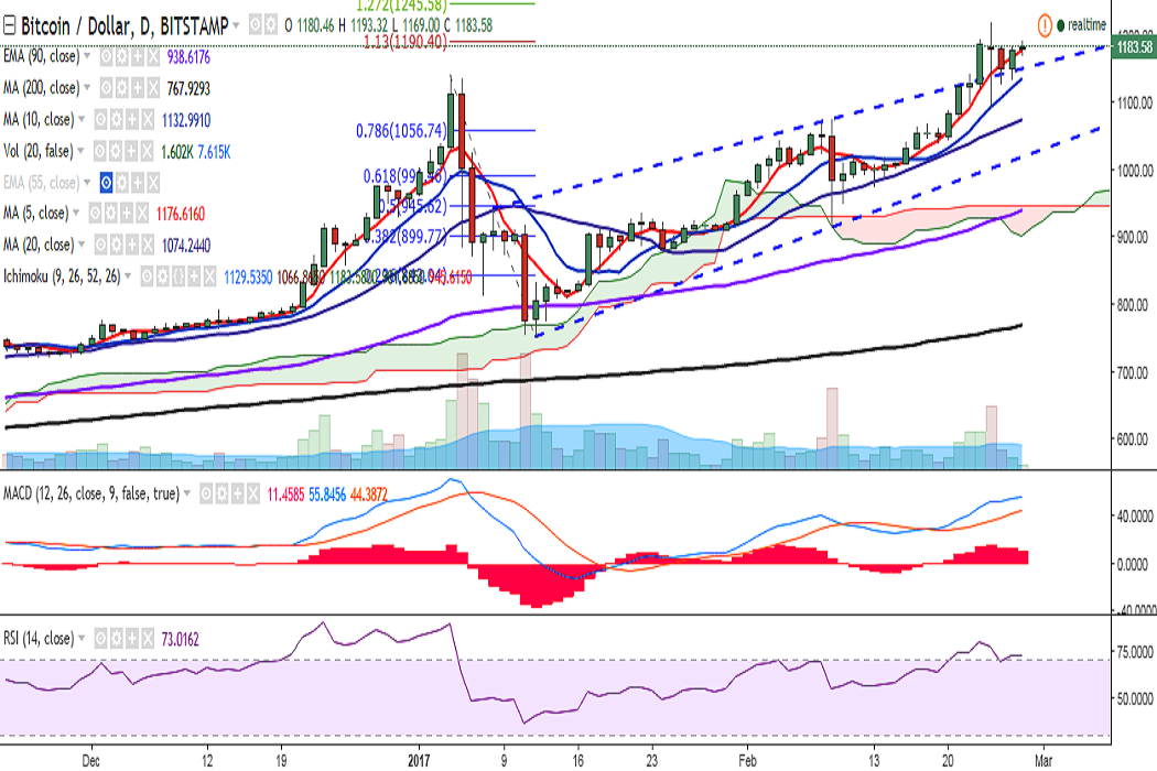 BTC/USD is once again inching closer to the 1200 mark and is currently trading at 1185 levels at the time of writing (Bitstamp).