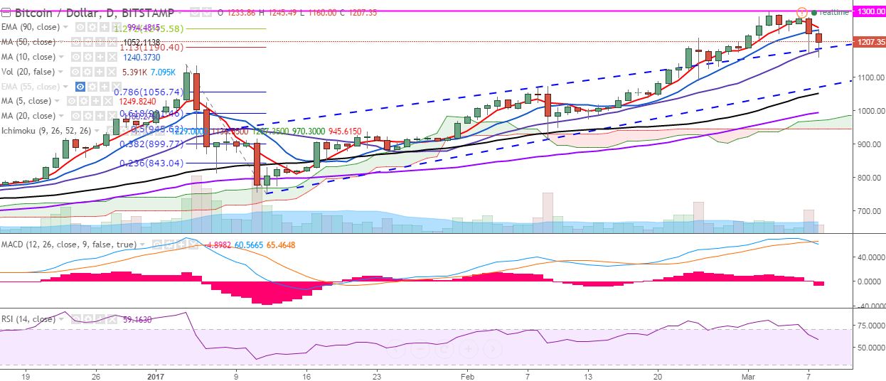 BTC/USD plunged from 1281 levels (March 07 high) to 1160 levels today, following recent comments from PBoC official. The pair is currently trading at 1202 levels at the time of writing (Bitstamp).