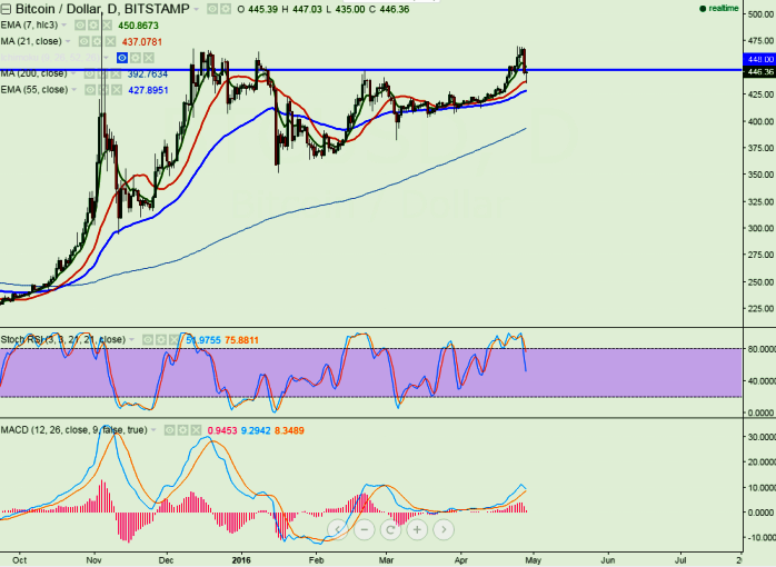 - BTC/USD has broken minor support $450 and declined till $435at the time of writing. It is currently trading around $448.