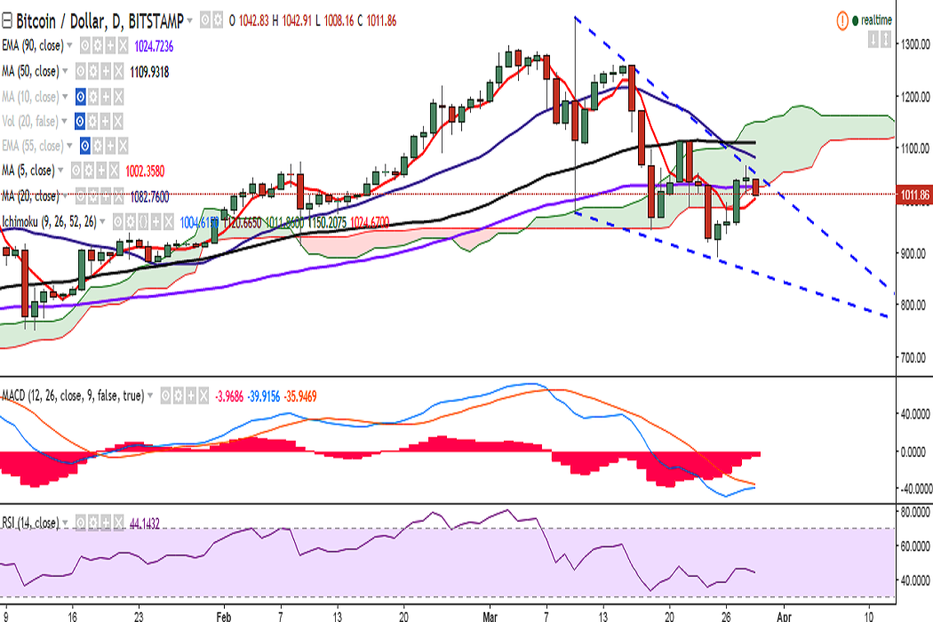 BTC/USD is trading in the red on Wednesday, as the SEC rejected SolidX bitcoin ETF proposal. It is currently trading at 1010 levels at the time of writing (Bitstamp).