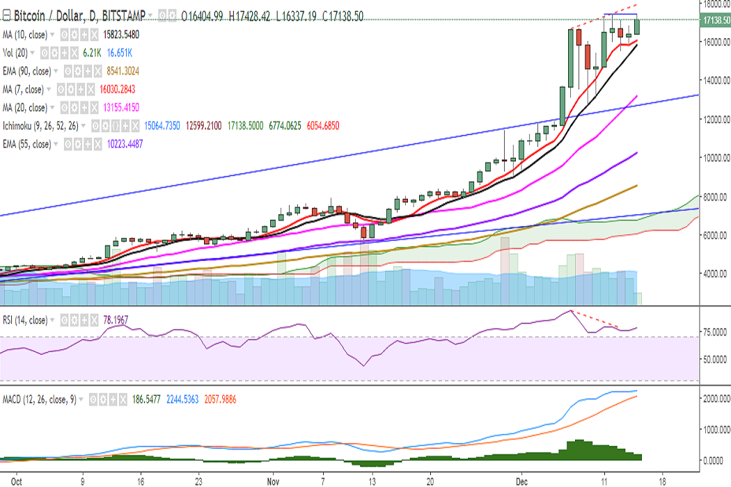 BTC/USD is trading higher on Friday and has hit 17428 levels so far in the day. It is currently trading at 17157 levels at the time of writing (Bitstamp).