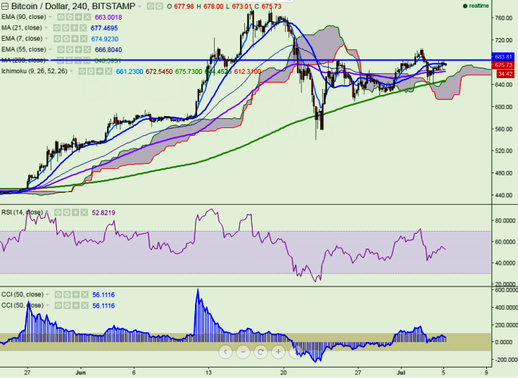 On the flipside, short-term support is seen at $662 (90 4H EMA) and any violation below will drag the pair till $646 (200 4H MA)/$621 (Jun 29 low).