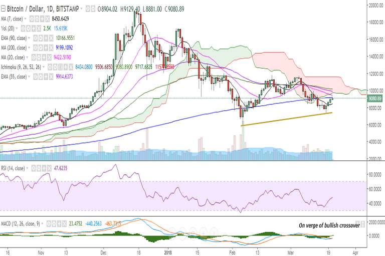 BTC/USD is trading higher on Wednesday as it broke above 10-DMA. It is currently trading at 9057 levels at the time of writing (Bitstamp).