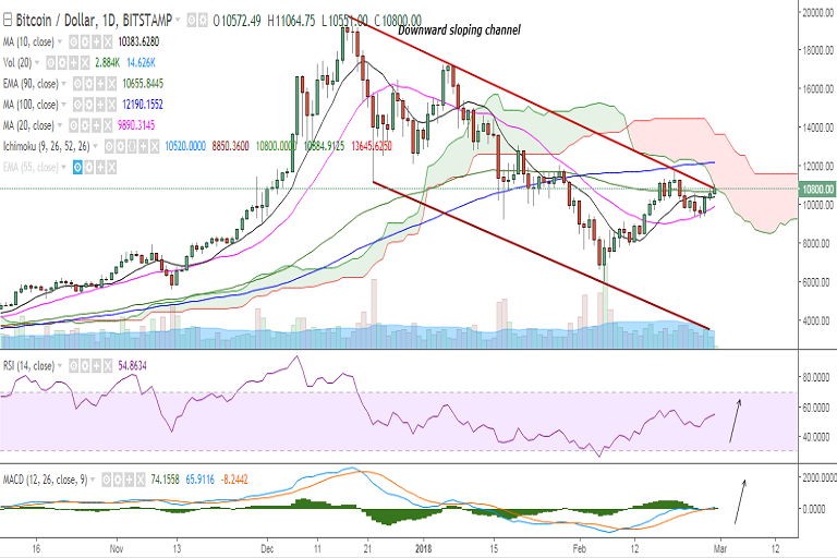 BTC/USD surged to 11064 levels on Wednesday as it broke above the trend line resistance. However, it could not hold its strength and is currently trading at 10800 levels at the time of writing (Bitstamp).