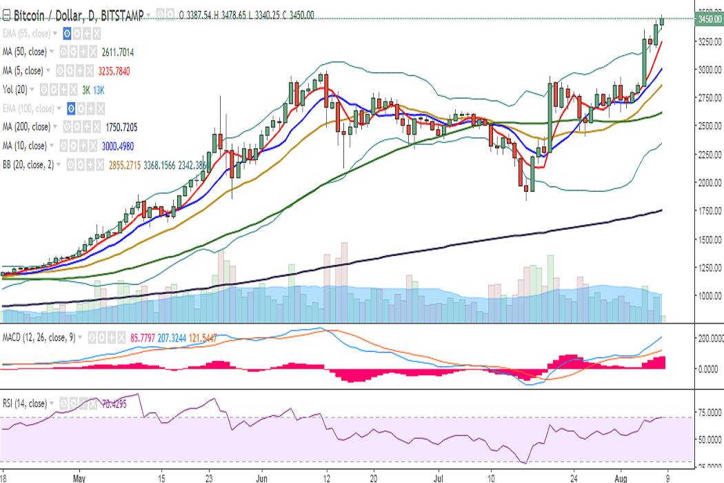 BTC/USD traded higher on Tuesday and hit a fresh all time high at 3478 levels so far in the day. It is currently trading at 3450 levels at the time of writing (Bitstamp).