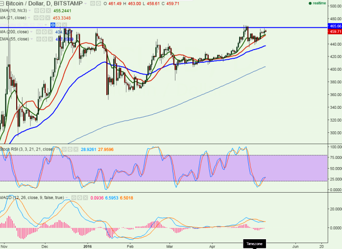 - BTC/USD has retreated after making a high of $464.79.It is currently trading around $460.68.