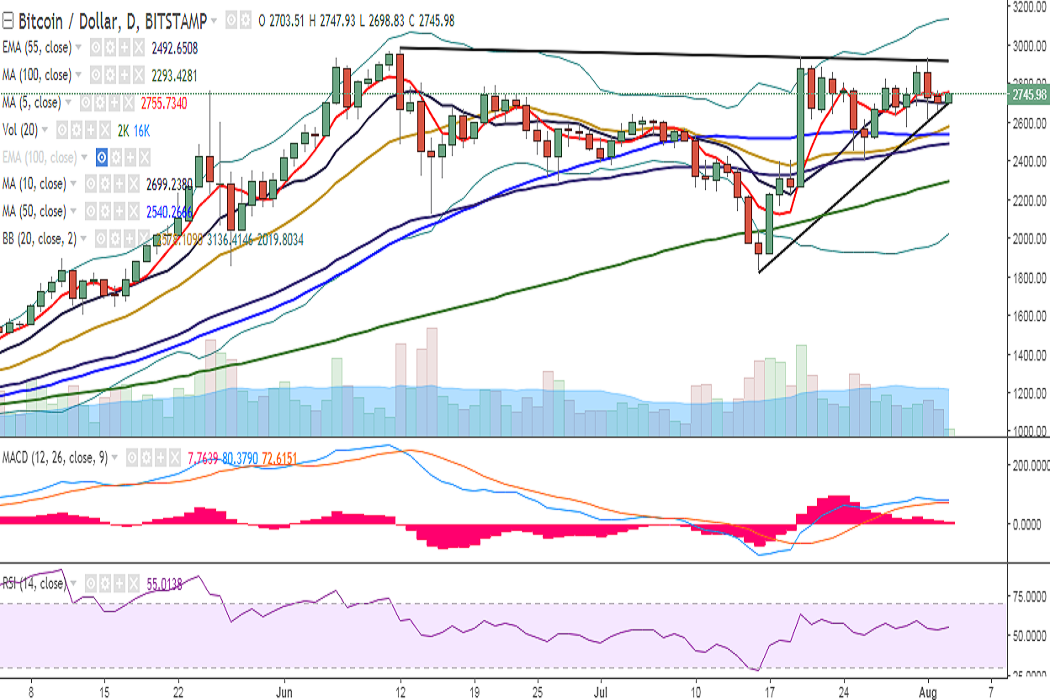 BTC/USD is trading in an extremely narrow range on Thursday between 5- and 10-DMA. It is currently trading at 2746 levels at the time of writing (Bitstamp).