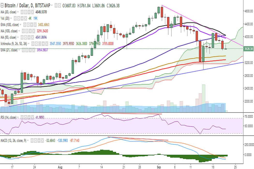 BTC/USD dropped to 3573 levels on Thurday before it closed at 3617 levels as it entered Ichimoku cloud. It is currently trading at 3648 levels at the time of writing (Bitstamp).