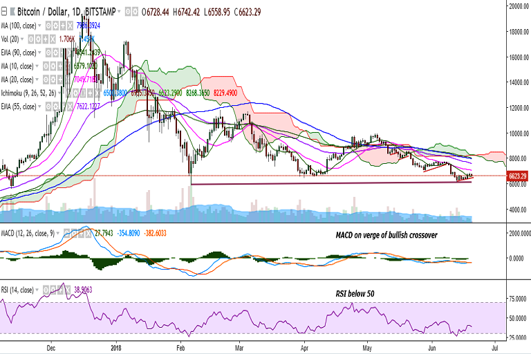 BTC/USD is trading in the red at 6630 levels on Wednesday (at press time) as it is trying to hold above 10-DMA (Bitstamp).