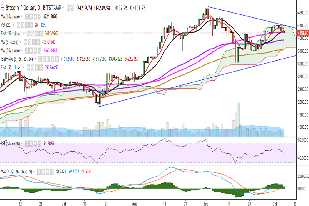 BTC/USD is continuing its downward move on Thursday as it broke below 10-DMA. It is currently trading at 4155 levels at the time of writing (Bitstamp).