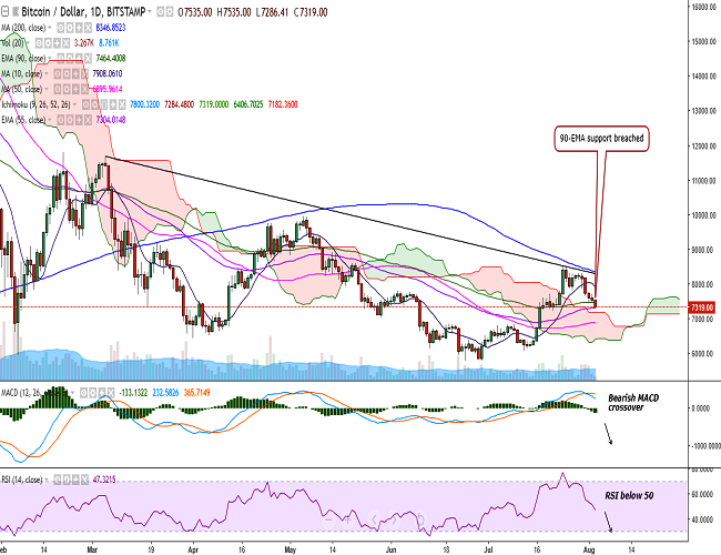 FxWirePro: BTC/USD trades lower following breach of 90-EMA support, good to go short on rallies