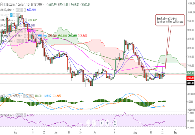 BTC/USD closed above 20-DMA at 6525 levels on Thursday and is trying to hold its strength above the 6500 mark.
