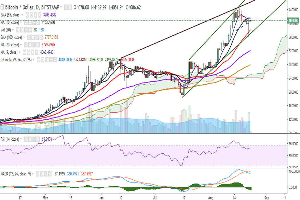 BTC/USD successfully closed above the 4000 mark after it fell to 3600 levels on August 22. It is currently trading at 4100 levels at the time of writing (Bitstamp).