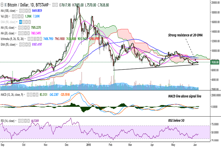 BTC/USD is trading in a narrow range on Wednesday with its upside capped by 20-DMA. It is currently trading at 7630 levels at the time of writing (Bitstamp).