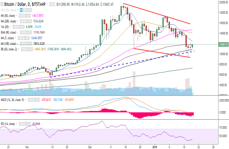 BTC/USD is struggling for a decisive break above 5-DMA and is currently trading at 11785 levels at the time of writing (Bitstamp).