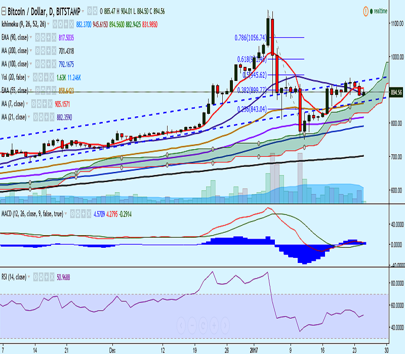 BTC/USD traded deep in the red on Tuesday and broke below 21-DMA hitting $881, as three of the leading Chinese bitcoin exchanges – BTCC, Huobi, OKCoin – implemented fee-based trading, starting January 24. The pair has slightly restored its strength and is currently trading at 893 levels at press time. (Bitstamp).