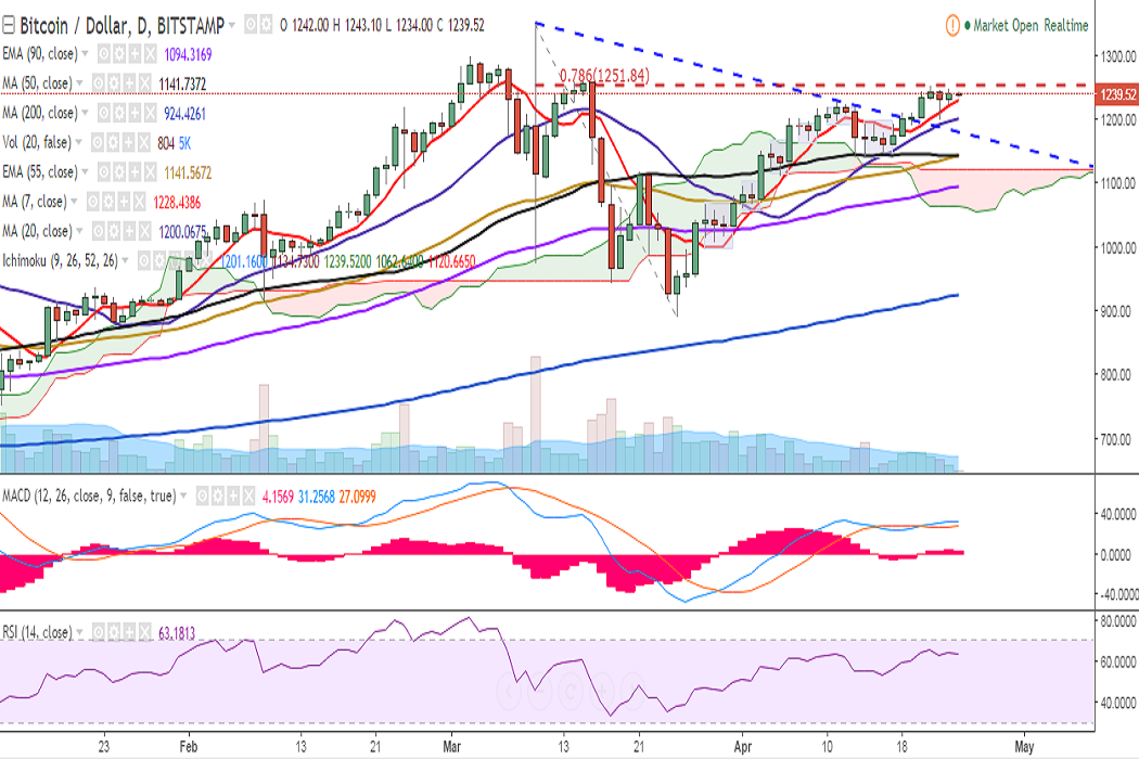 BTC/USD is trading in an extremely narrow range with its upside capped by 78.6% retracement of 1350 and 891.33. It is currently trading at 1239 levels at the time of writing (Bitstamp).