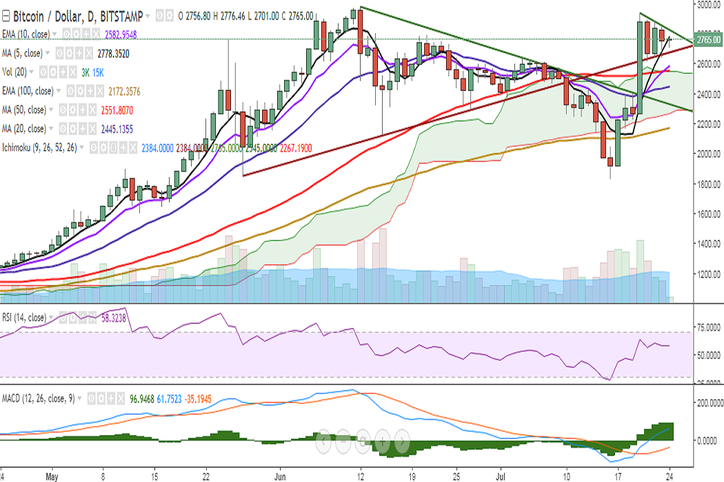 BTC/USD is trading in a narrow range, just shy of 5-DMA on Monday at 2751 levels at the time of writing (Bitstamp).