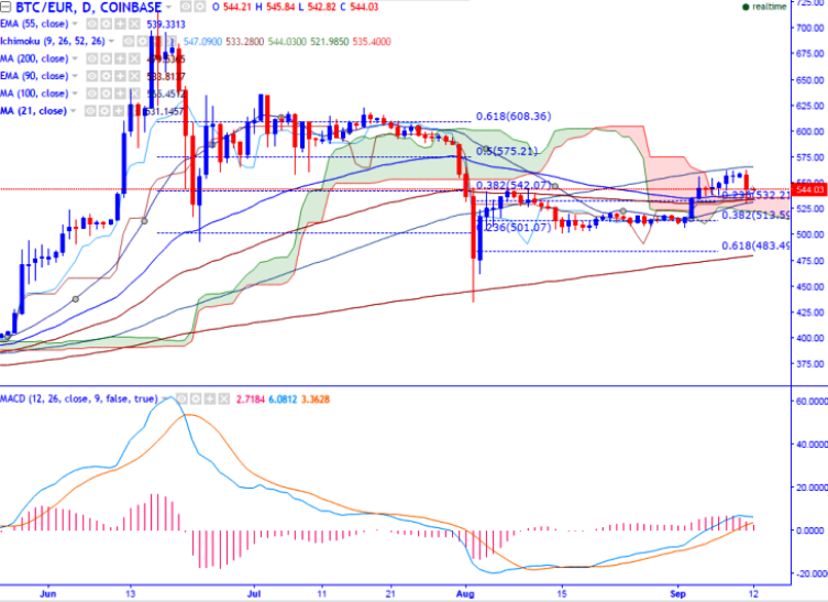 BTC/EUR is seen trading low in red on Monday. The pair has once again retreated after jumping till 100-day MA (COINBASE). It is currently trading around 543.98 at the time of writing.