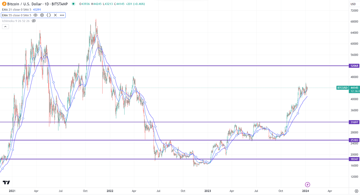 BTCUSD trading flat after upbeat US Non-Farm Rolls. The US economy has added 216000 jobs in Dec, above expectations of 168K. Unemployment rate unchanged at 3.7% vs. Estimate of 3.8%. It hit a low of $43200 at the time of writing and is currently trading around $44128.