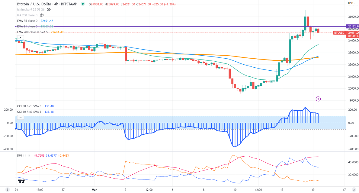 BTCUSD price surged above $25000 after mixed US CPI data.US CPI rose 0.40% last month in line with the estimate, below 0.50% the previous month. The yearly CPI declined to 6% in Feb, the smallest annual gain since Sep 2021. BTC hits a high of $26555 and currently trading around $24678.
