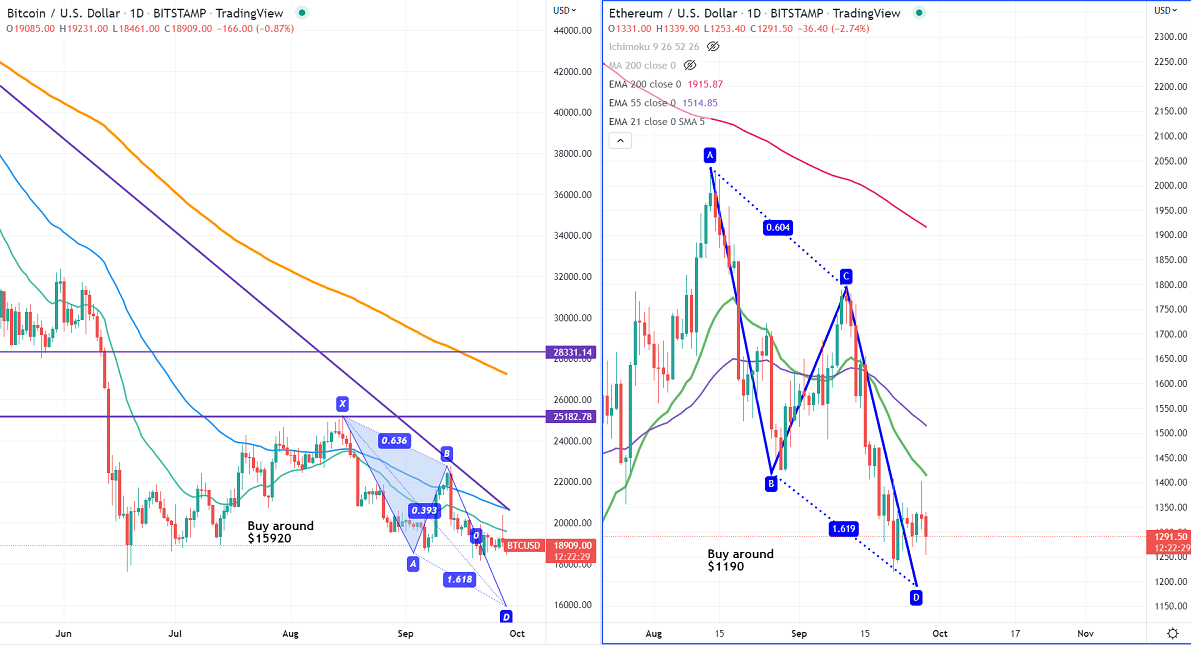 Harmonic chart pattern- Bullish AB=CD Pattern (BTCUSD and ETHUSD)