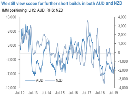 along with full-fledged antipodean easing cycles, we don’t view positioning metrics as especially stretched (refer 2nd chart). This should create enough room to let both currencies continue their downward medium-term slide. Near-term drivers to keep an eye on including the ongoing collapse in iron ore prices, AUD data (employment 14-15 Aug and GDP 9 Sept) NZD housing news.