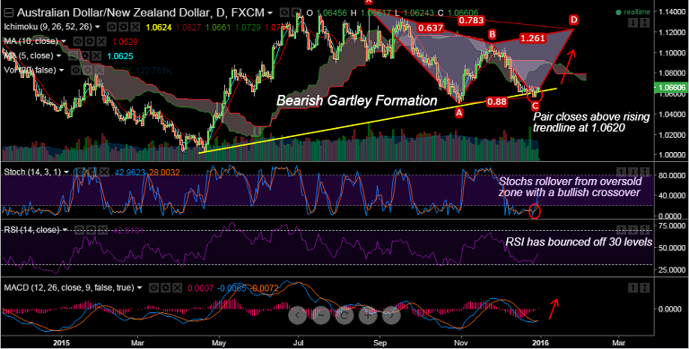 We see a Bearish Gartley formation on AUD/NZD charts. The pair dipped below strong trendline support on Dec 28th, but bears struggled to take the pair lower.