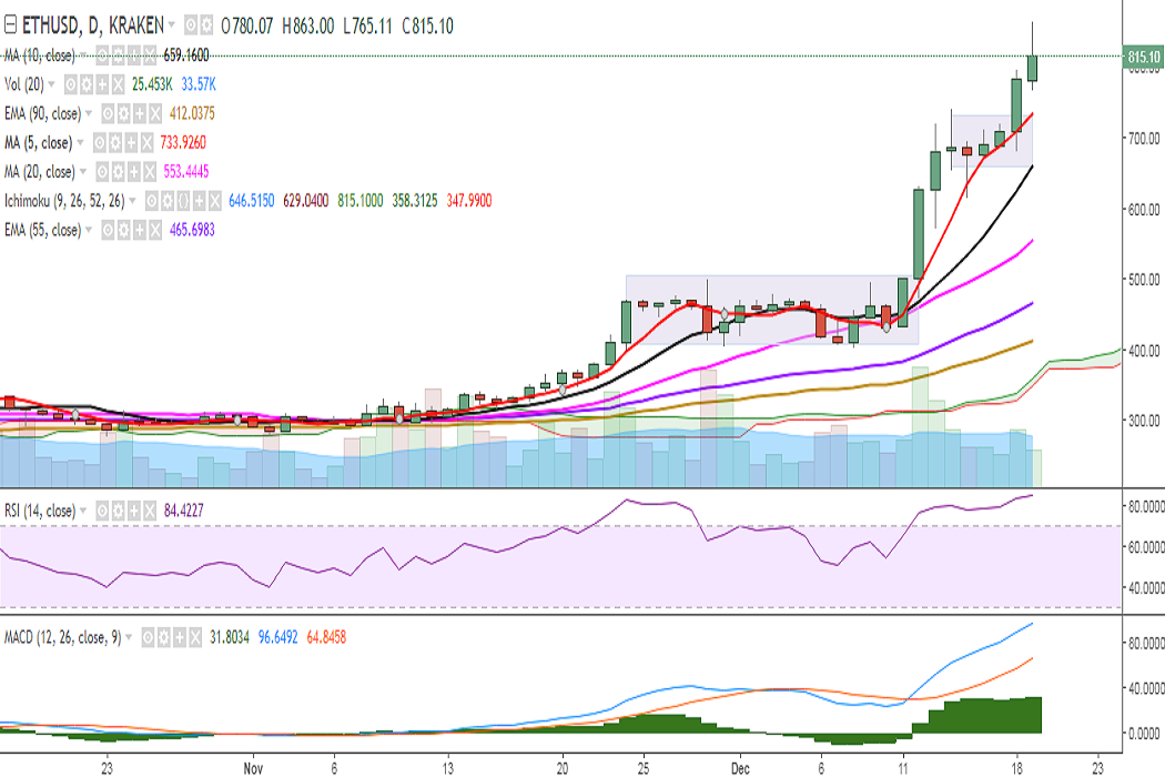 ETH/USD broke above 800 levels on Tuesday and has hit a fresh all-time high at 863 levels so far in the day. It is currently trading at 815 levels at the time of writing (Kraken).