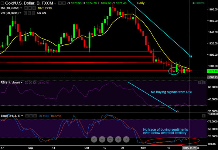 The precious metal has surpassed all major support levels where supply was seen more than demand and for now lingering support at around $1,071.43 levels after rejecting 1074.78.