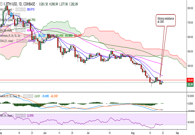 ETH/USD continues to consolidate in a narrow range as it faces strong resistance at 300 levels.