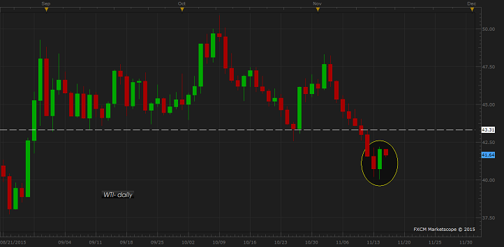 North American benchmark, WTI has been declining for eight consecutive days, before posting a major engulfing candle yesterday as tensions and fighting in Middle East edged up after France joined bombing raid in response to Friday's attack by ISIS, in Capital Paris, which left more than 120 dead and 350 injured.