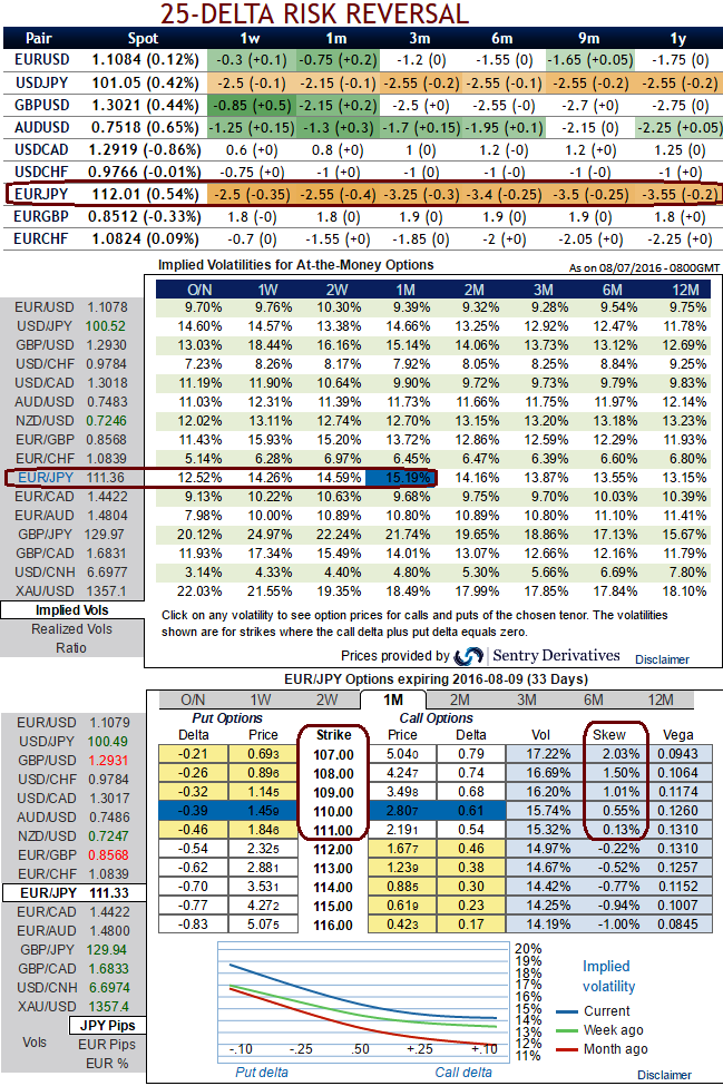 We recommend initiating shorts EURJPY positions for long-term hedging but by capitalizing on short-term upswings, preferably via options acknowledging the recent upticks in the implied volatility of Euro crosses (see nutshell).