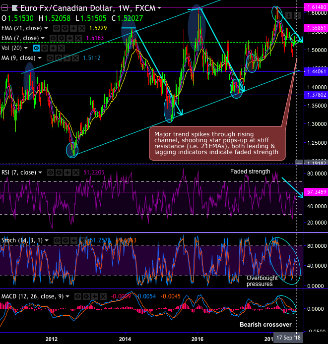 Technically, on a broader perspective, EURCAD’s major trend spikes through rising channel, but shooting star pops-up at stiff resistance at 1.5585 and 21EMAs, and hammer patterns at channel support (refer weekly plotting), both leading and lagging indicators signal faded strength. You could very well observe as and when the prices touched channel baseline and top line, the price pattern behaves in an adverse way.