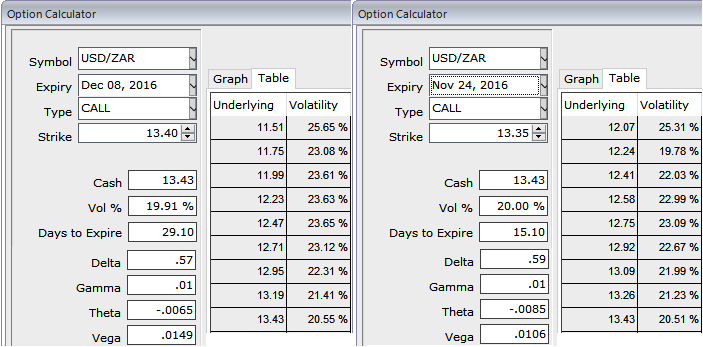 Long USDZAR in cash was stopped out, instead, open option spreads.