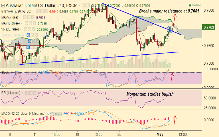 - Technically the pair is poised for upside. It has broken major trendline resistance at 0.7685 and is holding above 0.77 handle.