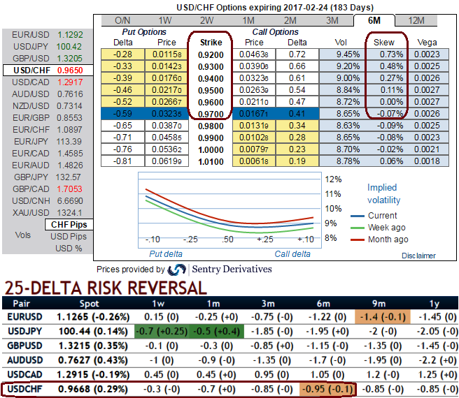 Contemplating above IVs and risk reversals, we USDCHF continues to slide but certainly shows spikes in between, as a result we could foresee some sort of either sloping or range bounded trading opportunities in the prevailing range of 0.9825 and 0.9519 levels in next 1-3 months or so.