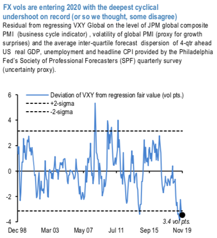 Mixed reception to the notion of FX vol being cheap: Whether it is due to a sunnier cyclical outlook for 2020, a more fundamental change in perceptions of fair value of volatility, or simple fatigue from fruitlessly spending premium to buy options in recent years, we encountered a surprising degree of disagreement around the (what we had thought is an open-and-shut) question of whether FX vol is at record levels of cheapness (refer above chart).